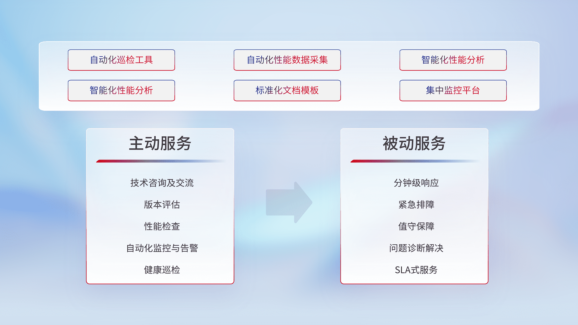智能化工具和标准化文档,,保障服务质量,,,,提供主动服务(包含技术咨询、、版本评估、、、性能检查、、、、自动化监控与告警、、健康巡检)和被动服务包含(分钟级响应、、、、紧急排障、、、值守保障、、问题诊断解决、、、、SLA服务)。。。。